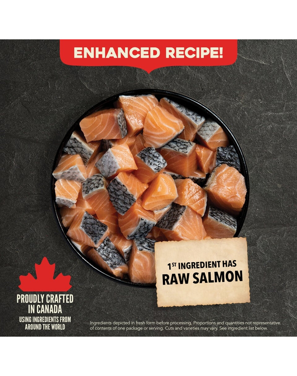Roher Lachs (22 %), getrockneter Hering (19 %), Perlgraupen, ganze Erbsen, schalenfreier Hafer, Schweinefett (8 %), ganzer Hafer, Kichererbsenfaser, Fischöl (1 %), Kalziumkarbonat, Kaliumchlorid, getrockneter Seetang, Salz, getrocknete Zichorienwurzel, frischer ganzer Kürbis, frischer ganzer Moschuskürbis, frische ganze Karotte, frische ganze Äpfel, frische ganze Birnen, frische ganze Zucchini, frischer Grünkohl, frischer Spinat, frische Rübenblätter, frische Rote-Bete-Blätter, ganze Cranberries, ganze Heidelbeeren, ganze Saskatoons, Kurkuma, Distel, Klettenwurzel, Lavendel, Baldrianwurzel, Hagebutten