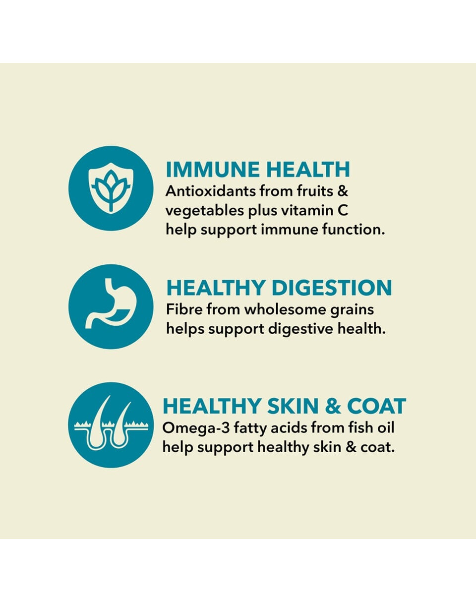 Hochwertige Zutaten in der Rezeptur sorgen für eine hohe Verdaulichkeit des Futters und eine gute Aufnahme der Nährstoffe. Das Fischfutter zeichnet sich durch eine geringe Allergenität und einen hohen Gehalt an ungesättigten Omega-3-Fettsäuren aus, die für die Funktion des Kreislauf- und Nervensystems sowie für eine starke Sehkraft, Haut und Fell des Hundes wichtig sind. Acana Wild Coast liefert hochwertiges Protein tierischen Ursprungs, das von Hunden am besten aufgenommen werden kann. Der Zusatz von Obst, Gemüse und Kräutern verbessert die Schmackhaftigkeit und den Geschmack des Futters. Äpfel, Birnen und Kürbis liefern natürliche Vitamine und Antioxidantien zur Unterstützung des Immunsystems.