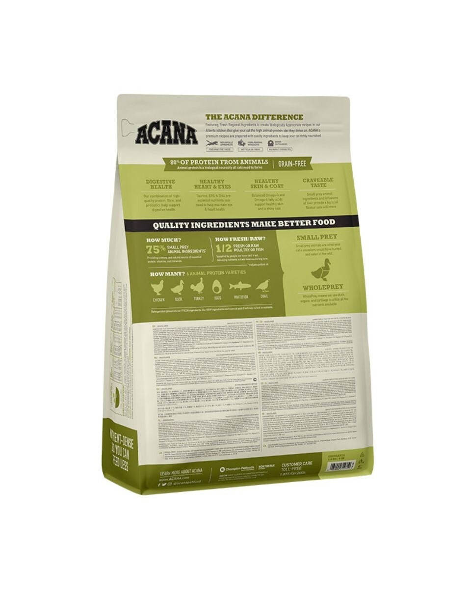 Acana Grasslands ist angelehnt an das natürliche Ernährungskonzept der Wildkatzen und enthält daher einen besonders hohen Fleischanteil. Die Rezeptur beinhaltet 75% Fleisch & Fisch und kommt ganz ohne Getreide sowie stärkehaltigem Gemüse, wie z.B. Kartoffeln, aus. Die gefriergetrockneten Komponenten vom Huhn & Truthahn sorgen für allerhöchsten Geschmack. Durch die sorgfältige Auswahl der Zutaten und der schonenden Produktion sind weitgehend alle benötigten Vitamine und Mineralstoffe bereits enthalten. Es müssen daher nur wenige Zusatzstoffe hinzugefügt werden, um Ihre Katze optimal zu ernähren.