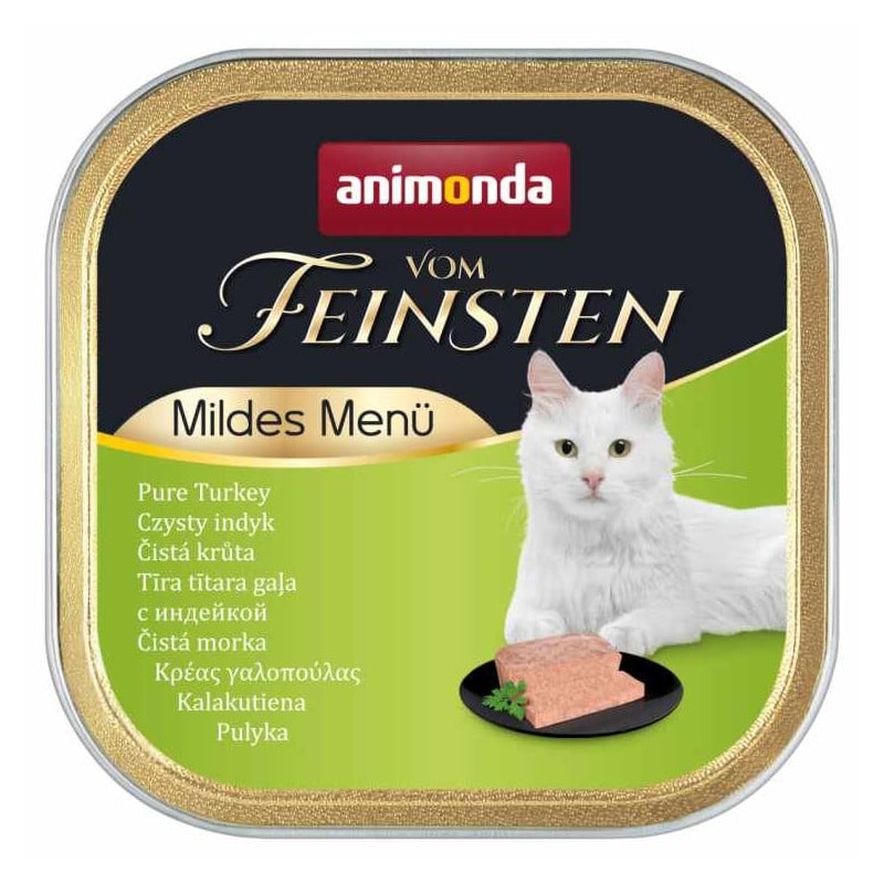 Vom Feinsten Adult Mildes Menu ist ein vollwertiges Futter, das speziell für erwachsene Katzen im Alter von 1 bis 6 Jahren entwickelt wurde. Delikater, leicht verdaulicher Truthahn – ohne Innereien und Leber – schafft ein außergewöhnliches, schmackhaftes Festmahl selbst für die wählerischsten Vierbeiner. Die Fleischpastete mit großen Stückchen Truthahn bietet alle notwendigen Nährstoffe und sorgt für die Gesundheit und Energie der Katze.