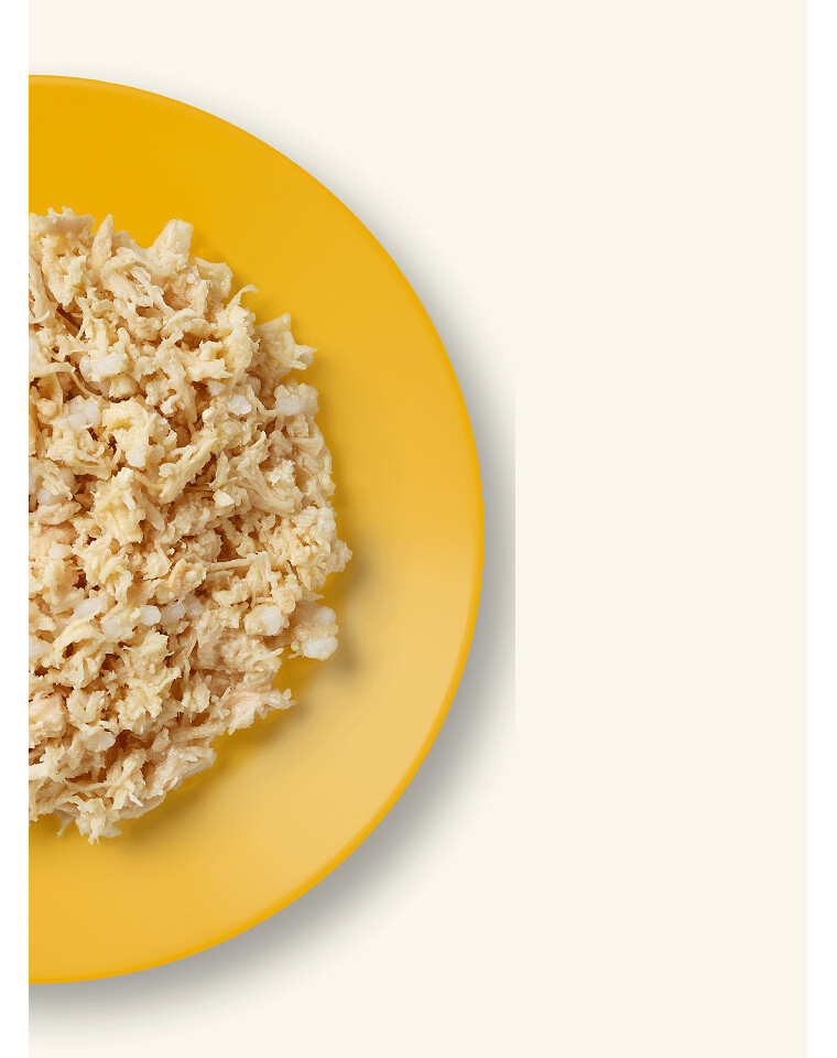 Hähnchenbrust (70%), Hühnerbrühe, Käse (5%), Reis.
