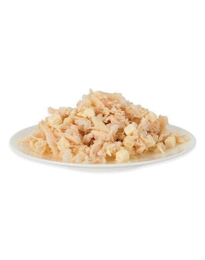 70% Huhn, 5% Käse, 1% Reis, 24% Kochwasser