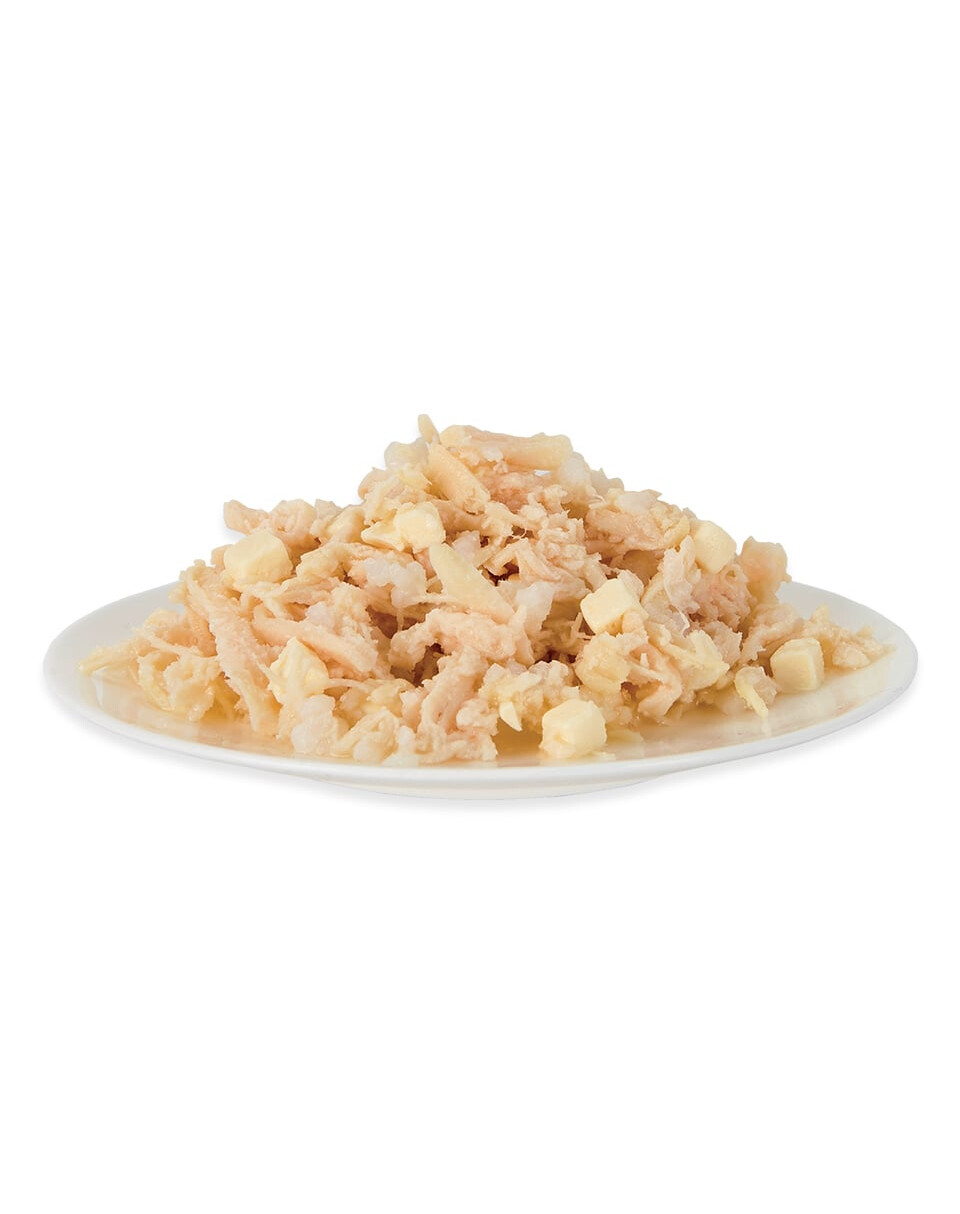 Hähnchenbrust 70 %, Käse 5 %, Reis 1 %, Hühnerbrühe 24 %. Keine Extras.