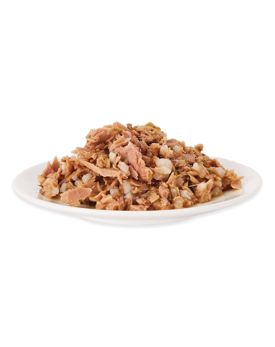 Thunfischfilet 75 %, Reis 6 %, Fischbrühe 19 %. Keine Extras.