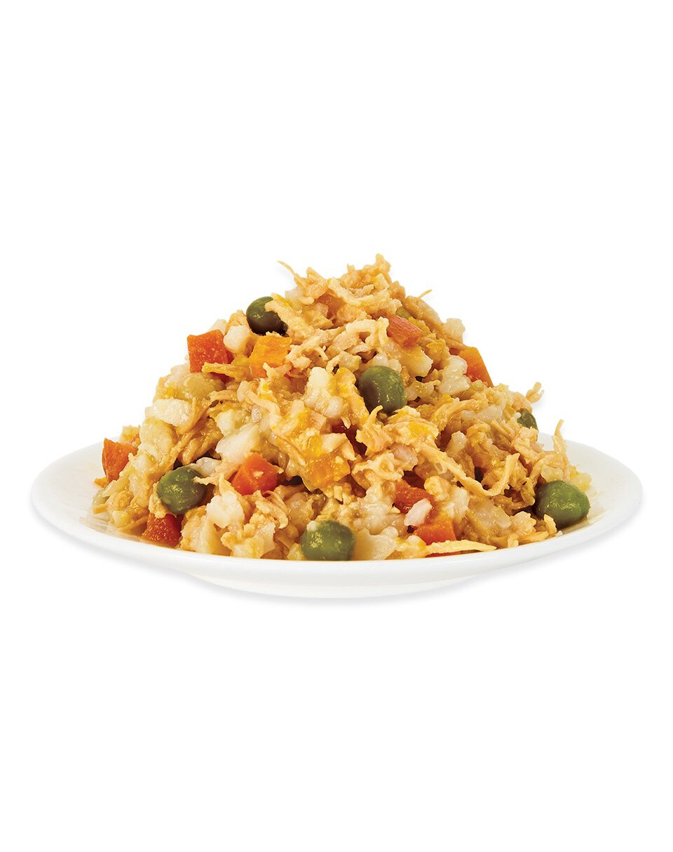 Hühnerbrust (45%), Kürbis (8%), Karotten (8%), Erbsen (8%), Reis (5%), Hühnerbrühe (26%).