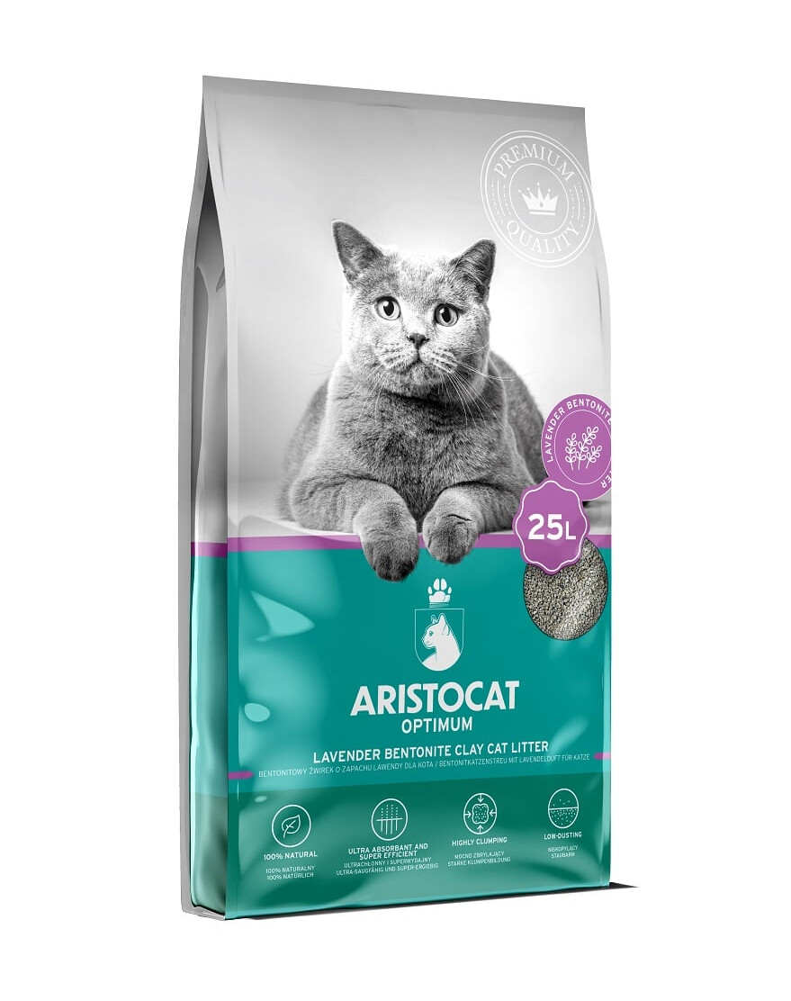 Die duftende Zusammensetzung von Aristocat Optimum Streu hinterlässt einen angenehmen und frischen Lavendelduft in der Umgebung der Katzentoilette. Die Bentonit-Tonerde ist sanft zu den Pfoten der Kätzchen, und der Geruch ermutigt auch Katzen, die bisher nicht an Sauberkeit gewöhnt waren, die Katzentoilette zu benutzen.
