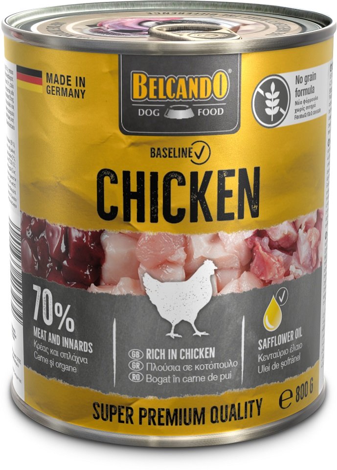 Hühnerfleisch, -herzen und -mägen (26 %); Fleischbrühe (28,8 %); Fleisch; Leber; Magen; Herz; Niere; Lunge; getrocknete Eierschalen; Mineralstoffe; Distelöl (0,2 %)