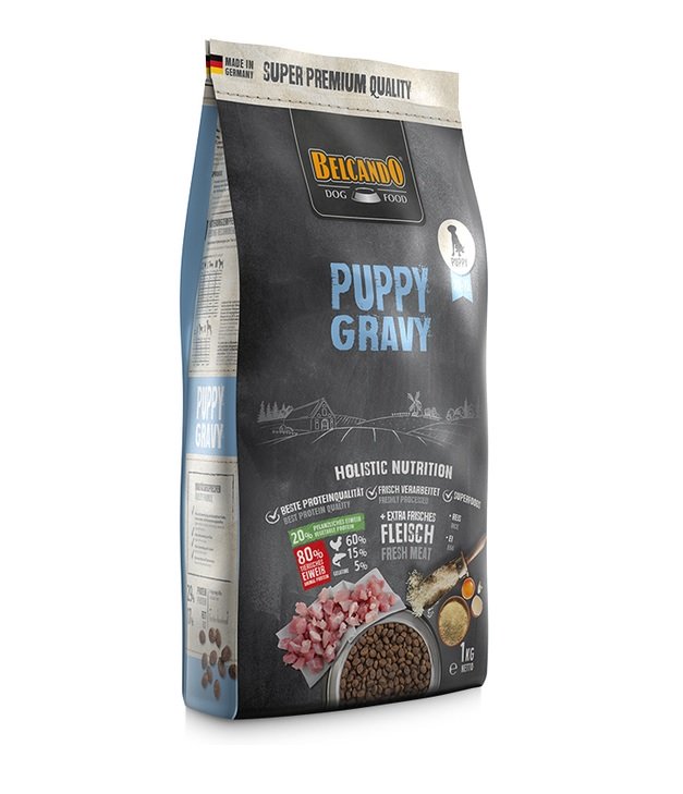 Zur Erleichterung der Anfütterung wurde BELCANDO® Puppy gravy mit einer speziellen Sauce ausgestattet. Unter sorgfältigem Anrühren von 3 Teilen BELCANDO® Puppy gravy mit 1 Teil warmem Wasser (40-50 °C) bildet sich ein besonders schmackhafter Soßenüberzug über den Futterpartikeln. Dieser regt die Welpen zur Futteraufnahme an. Später kann BELCANDO® Puppy gravy bei Bedarf auch trocken verfüttert werden.