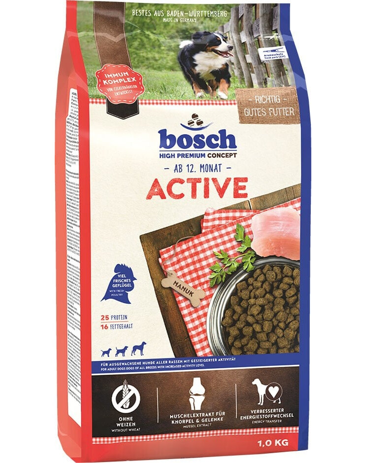 ACTIVE ist ideal für erwachsene Hunde mit erhöhtem Energiebedarf zur Unterstützung der optimalen Ausdauer und Leistungsfähigkeit (z. B. Hunde im Wach- & Schutzdienst, Sporthunde, usw.).