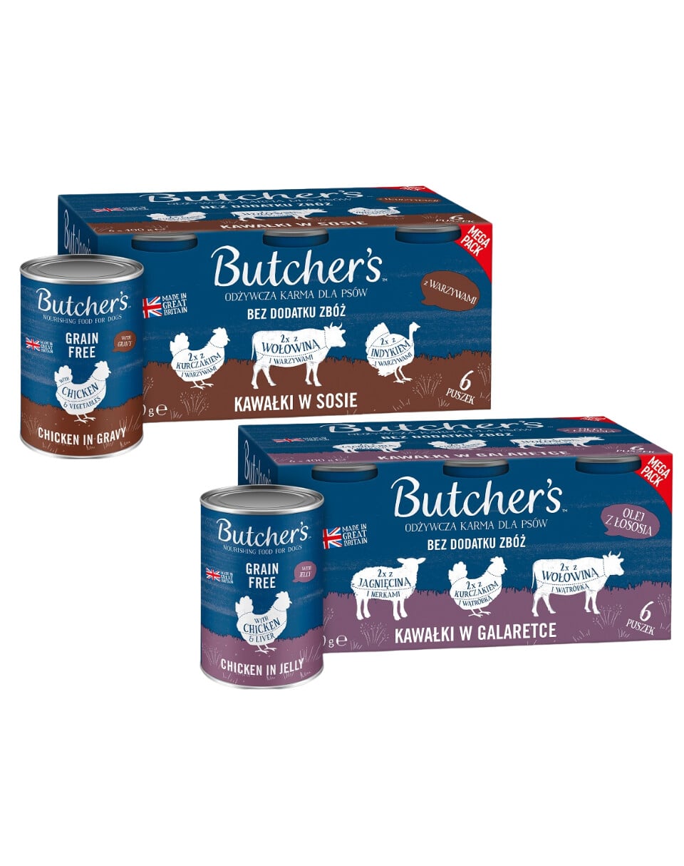 BUTCHR'S Originalrezept in Gelee ist ein komplettes Hundefutter, das nicht nur schmackhaft ist, sondern auch eine Reihe von Vorteilen bietet. In der Packung finden Sie 6 leckere Varianten:2x mit Huhn und Leber, 2x mit Lamm und Niere und 2x mit Rind und Leber.
