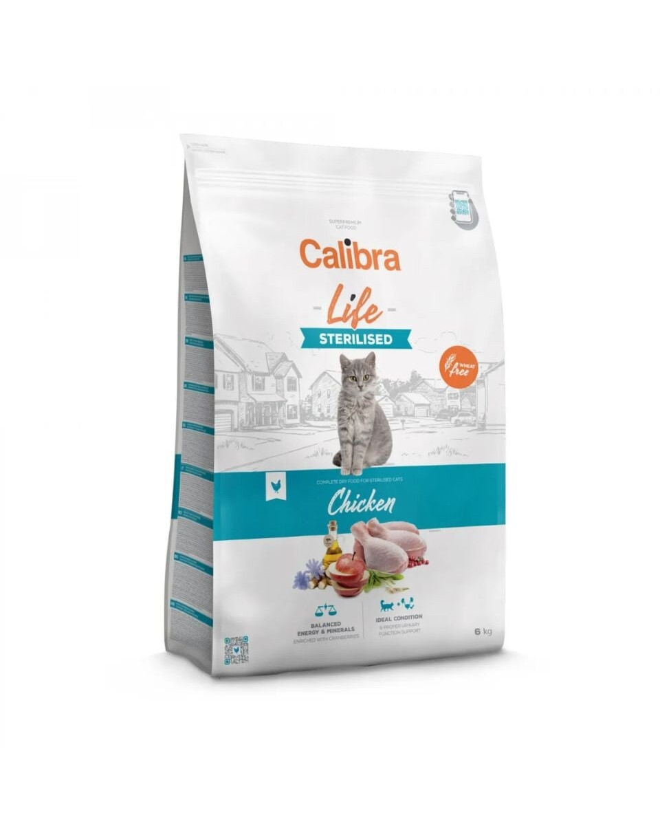 Calibra Cat Life Sterilised Chicken ist ein vollwertiges, getreidefreies Super-Premium-Futter, das speziell für erwachsene Katzen nach Sterilisation oder Kastration entwickelt wurde, basierend auf einem hohen Anteil an Hühnerfleisch, einschließlich frischem.