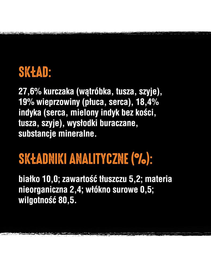 Zutaten: Huhn 24%* (Leber, Körper, Hälse), Schweinefleisch 24% (Lunge, Herz), Truthahn 20%* (gemahlener Truthahn ohne Knochen, Körper, Hälse), Rübenschnitzel, Mineralstoffe.