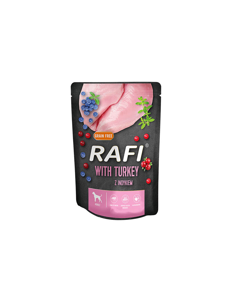 Ein Futter mit einem hohen Anteil an Putenfleisch ist eine Eiweißquelle von hoher biologischer Qualität. Außerdem wird das Futter durch den Anteil an Putenherzen mit Methionin, fettlöslichen Vitaminen und Mineralien angereichert. Die anderen Rohstoffe tierischen Ursprungs gewährleisten eine hohe Verdaulichkeit aller Nährstoffe und liefern zusätzlich Fett mit einer sehr wertvollen Fettsäurezusammensetzung. Das Vorhandensein von Fettsäuren der n-6-Familie im Truthahnfett macht das Futter zu einem nützlichen Bestandteil der täglichen Ernährung des Hundes, um die normale Funktion der Haut und das Aussehen des Fells zu erhalten. Der Zusatz von Leinöl gleicht das Verhältnis von mehrfach ungesättigten Fettsäuren der n-3- und n-6-Familie aus und garantiert die Aufrechterhaltung des richtigen Zustands des gesamten Organismus. Durch die Auswahl der Rohstoffe und die Wärmebehandlung bleibt die hohe Schmackhaftigkeit des Futters erhalten.