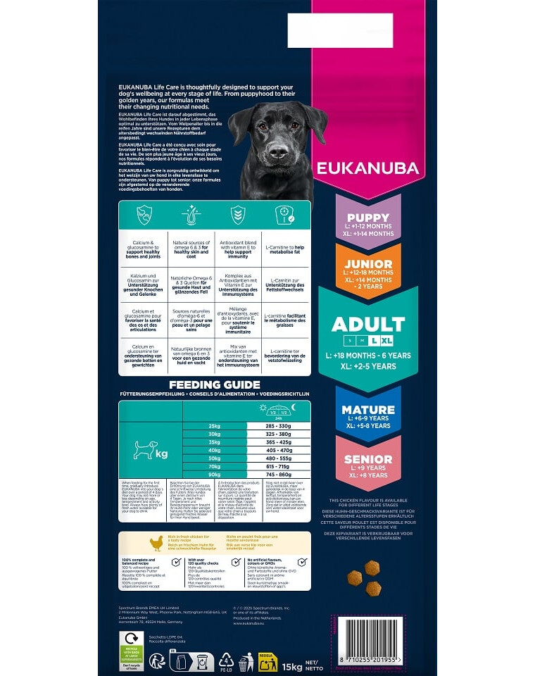 EUKANUBA Life Care ist eine Premium-Futterlinie, die auf wissenschaftlichen Erkenntnissen basiert, um die Bedürfnisse von Hunden in jeder Lebensphase zu unterstützen. Die Variante Adult Large Breeds Chicken wurde für erwachsene Hunde großer Rassen im Alter von 18 Monaten bis 6 Jahren sowie für Hunde riesiger Rassen im Alter von 2 bis 5 Jahren entwickelt.