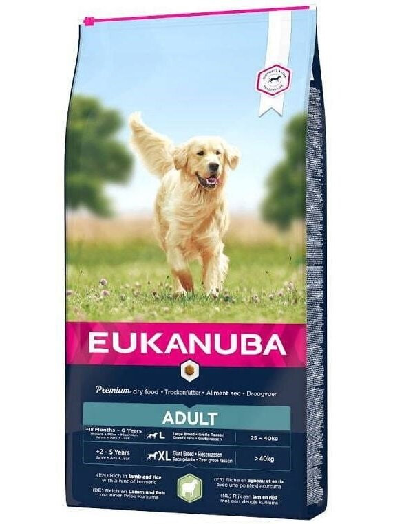 EUKANUBA Adult Large Breeds ist ein Futter für ausgewachsene Hunde großer Rassen, reich an Lamm und Reis. Es ist ideal für Rassen wie den Deutschen Schäferhund, Labrador, Rottweiler und Golden Retriever.