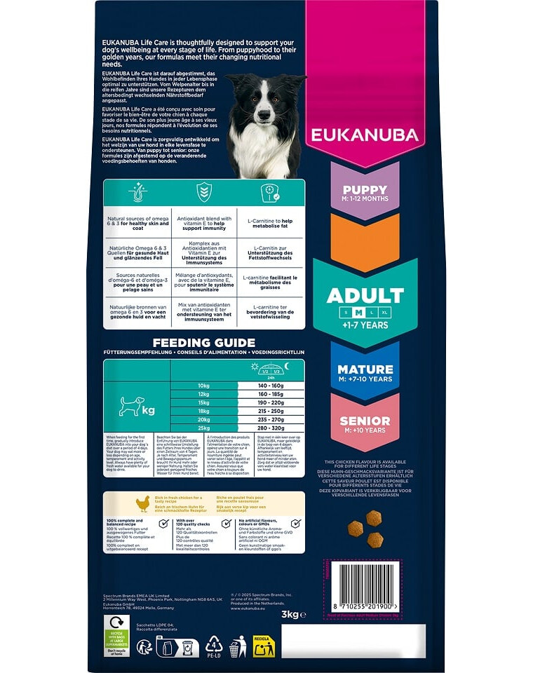 EUKANUBA Life Care ist eine Premium-Futterlinie, die in Zusammenarbeit mit Ernährungsexperten entwickelt wurde, um Hunden eine Ernährung zu bieten, die auf ihr Alter und ihre Bedürfnisse abgestimmt ist. Diese Rezeptur wurde speziell für erwachsene Hunde mittelgroßer Rassen entwickelt, die im Alter von 1 bis 7 Jahren eine Ernährung benötigen, die ihre Energie, Immunität und Vitalität unterstützt.