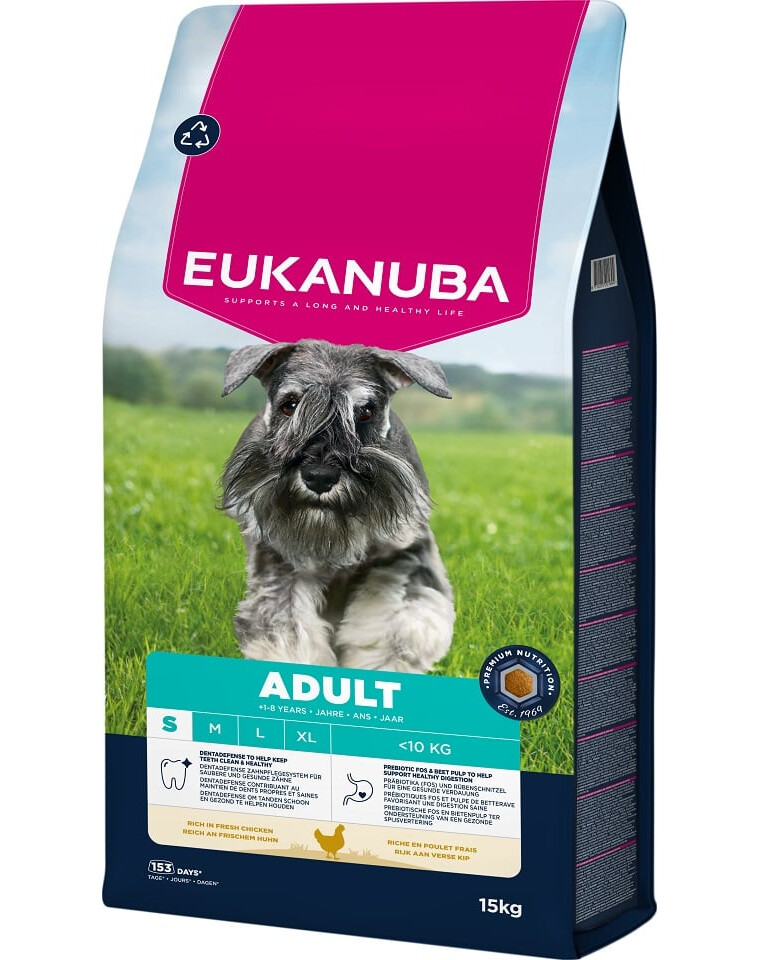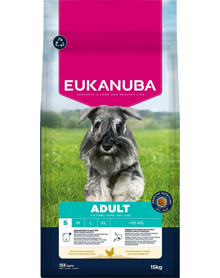 Das Trockenfutter EUKANUBA für erwachsene Hunde, reich an frischem Huhn, ist 100% vollständig und ausgewogen und ideal für kleine Rassen im Alter von 1 bis 8 Jahren.