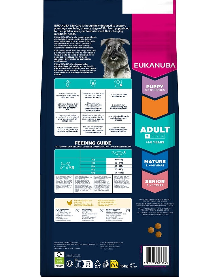 Erwachsene Hunde kleiner Rassen sind voller Energie und benötigen eine Ernährung, die ihren täglichen Bedürfnissen gerecht wird. EUKANUBA Life Care wurde von Experten entwickelt, um ihre Gesundheit und Vitalität – jeden Tag – zu unterstützen. Diese Rezeptur auf Basis von frischem Huhn liefert hochwertiges Protein, das für starke Muskeln und eine hervorragende Kondition Ihres Haustieres sorgt.