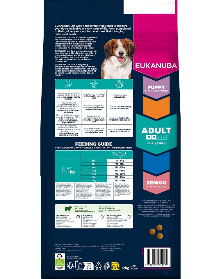 EUKANUBA Life Care ist eine Premium-Futterlinie, die auf wissenschaftlichen Erkenntnissen basiert, um die Bedürfnisse von Hunden in jeder Lebensphase zu unterstützen. Die Variante Adult Small & Medium Breeds Lamb & Rice wurde für erwachsene Hunde kleiner und mittelgroßer Rassen im Alter von 1–7 Jahren entwickelt.