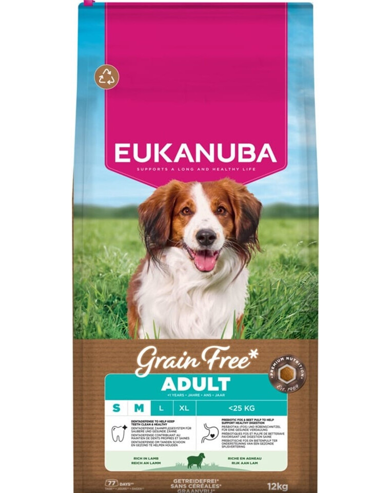 EUKANUBA Grain Free Adult Small & Medium Lamb ist ein vollwertiges, getreidefreies Trockenfutter für erwachsene Hunde kleiner und mittelgroßer Rassen ab 1 Jahr. Die Rezeptur mit niedrigem Allergengehalt wurde für Hunde mit empfindlichem Verdauungssystem und Neigung zu Getreideunverträglichkeiten entwickelt und unterstützt deren tägliche Kondition und Wohlbefinden.