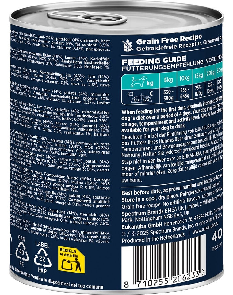Zutaten: Huhn (46%), Lamm (14%), Kartoffeln (4%), Mineralstoffe, Rübenpulpe (0.5%), Lachsöl (0.5%), Inulin (0.4%), MOS (0.3%).
