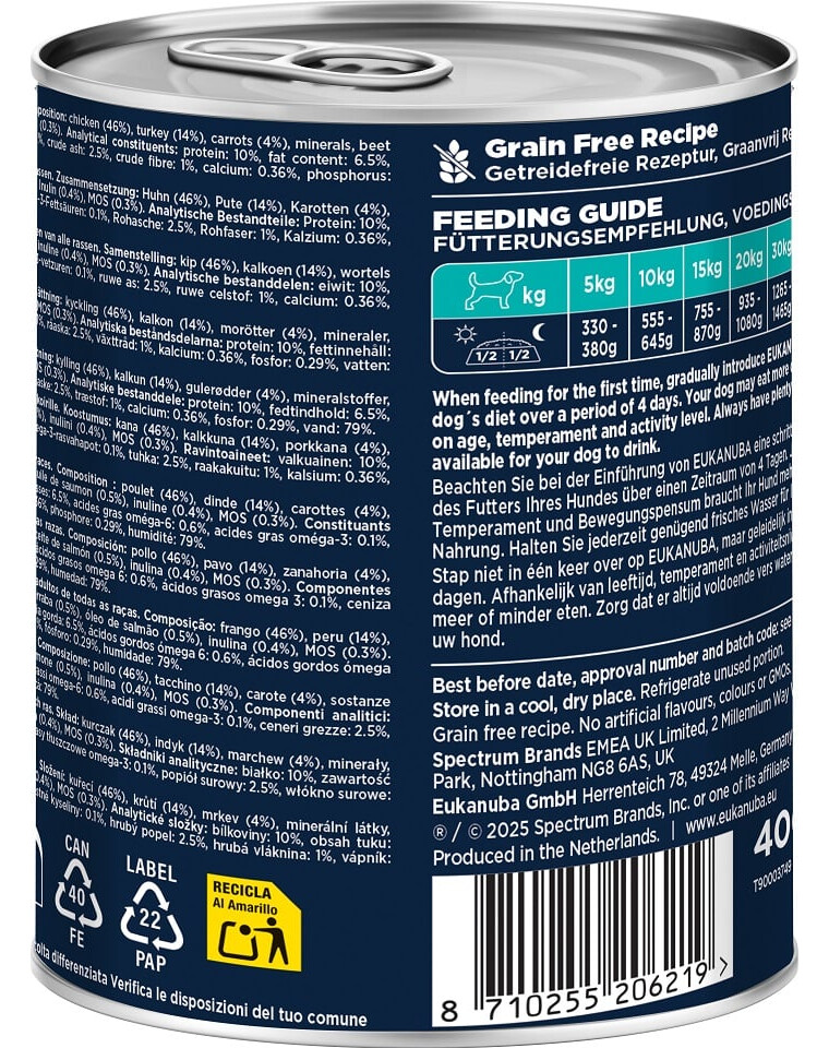 Zutaten: Huhn (46%), Truthahn (14%), Karotte (4%), Mineralstoffe, Rote-Bete-Pulpe (0.5%), Lachsöl (0.5%), Inulin (0.4%), MOS (0.3%).