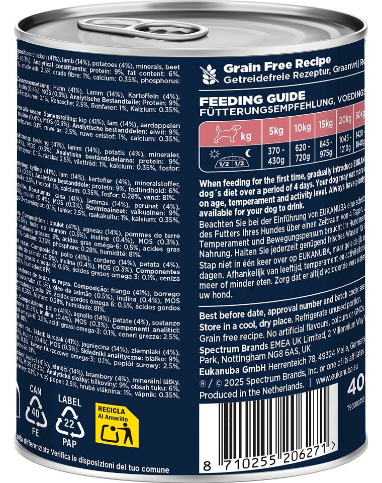 Das Futter hat die Form einer groben Pastete mit sichtbaren Fleisch- und Gemüsestücken, was ihm einen außergewöhnlichen Geschmack verleiht und dafür sorgt, dass Hunde es mit großer Freude fressen. Das Produkt enthält keine künstlichen Farbstoffe, Aromen oder Konservierungsstoffe. Es kann alleine oder in Kombination mit dem trockenen Futter von EUKANUBA gegeben werden, um eine gesunde, nahrhafte und schmackhafte Mahlzeit zu kreieren.