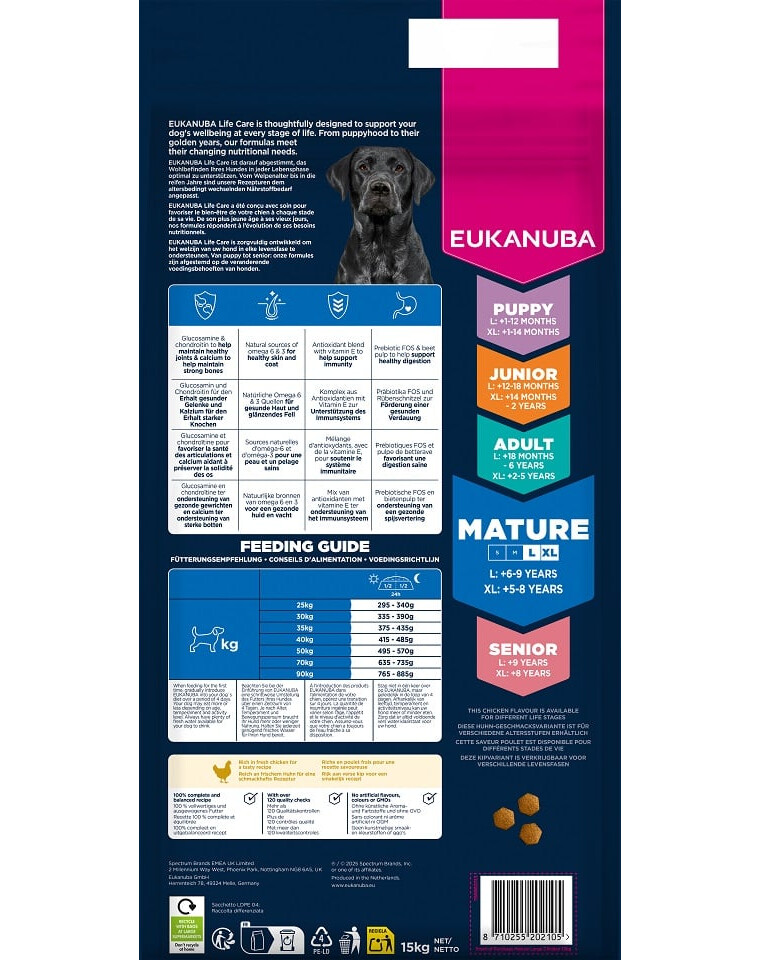 EUKANUBA Life Care ist eine Premium-Futterlinie, die auf wissenschaftlichen Erkenntnissen basiert und auf die Bedürfnisse von Hunden in jedem Lebensabschnitt eingeht. Dieses Futter wurde speziell für reife Hunde großer Rassen im Alter von 6–9 Jahren (für Riesenrassen: 5–8 Jahre) entwickelt und liefert wertvolles Protein aus frischem Huhn sowie vollwertige Zutaten, die ein gesundes Altern und Vitalität unterstützen.