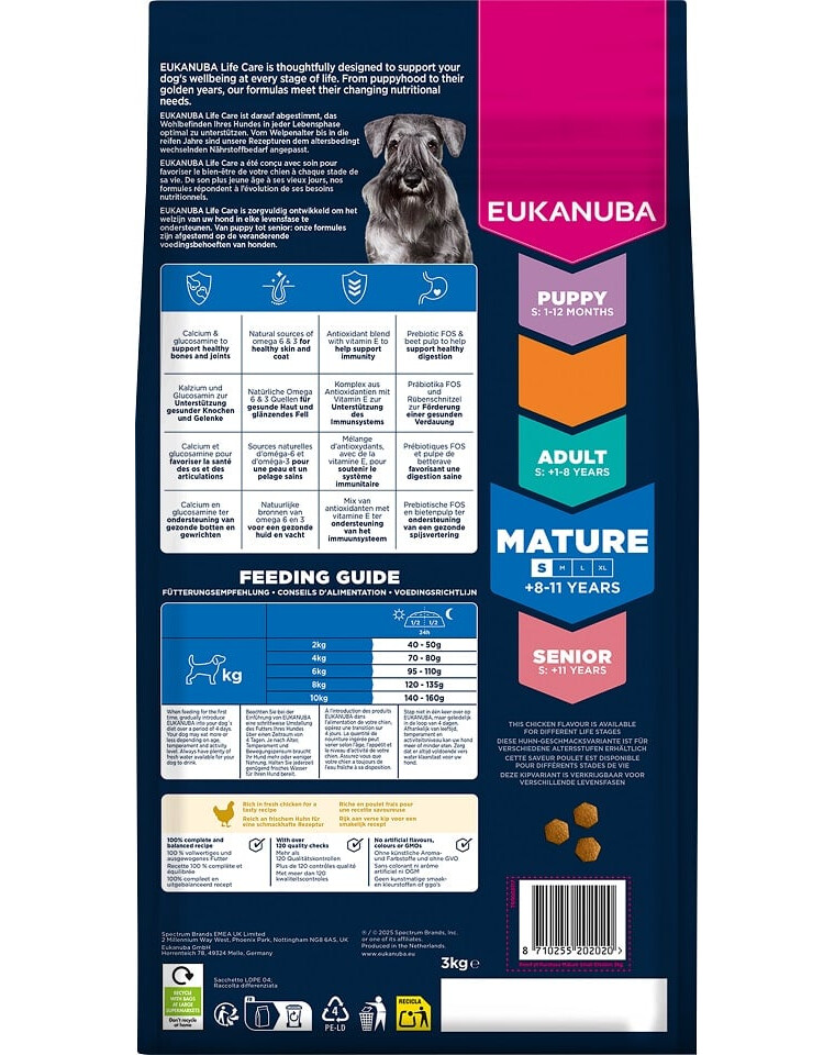 EUKANUBA für reife Hunde, reich an frischem Huhn, ist 100% vollständiges und ausgewogenes Trockenfutter und ideal für kleine Rassen im Alter von 8–11 Jahren, das hochwertiges Protein liefert, das die Muskelkraft und die richtige Körperkondition unterstützt.
