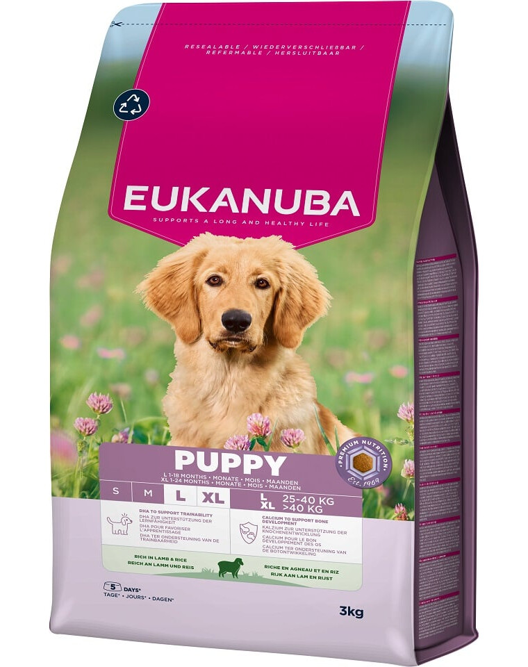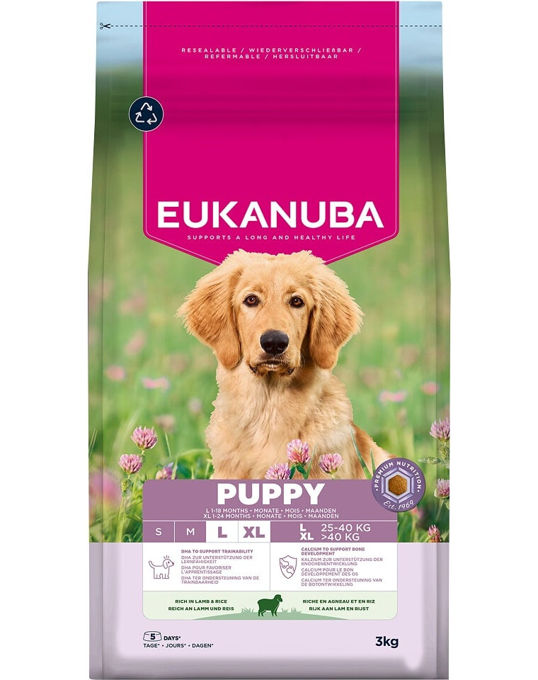 Dieses Trockenfutter von EUKANUBA für Welpen, reich an Lamm und Reis, ist 100% vollständig und ausgewogen und ideal für große Rassen im Alter von 1–18 Monaten (und bis zu 24 Monaten bei Riesenrassen).