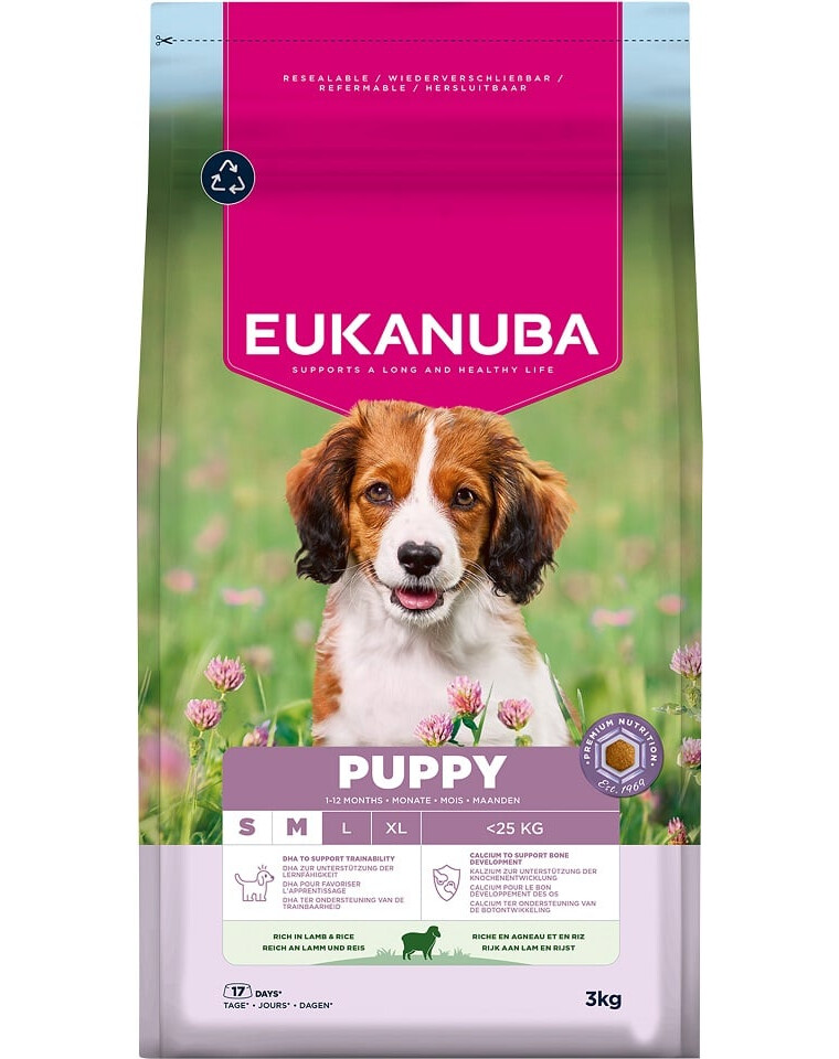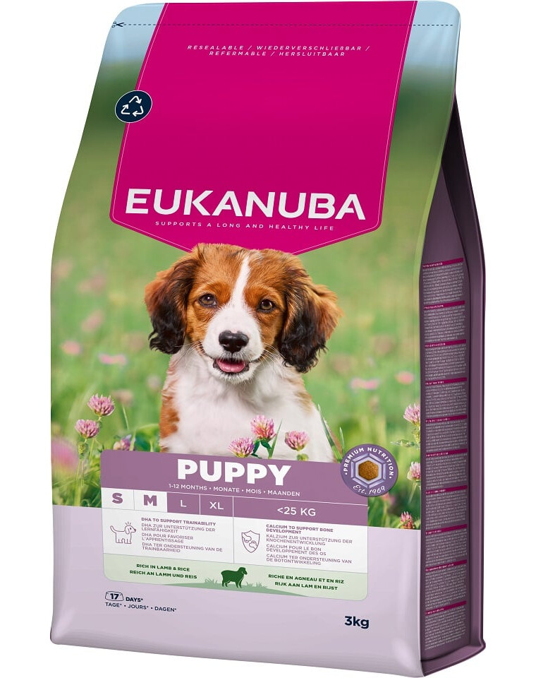 Dieses Trockenfutter von EUKANUBA für Welpen, reich an Lamm und Reis, ist 100% vollständig und ausgewogen und ideal für Hunde kleiner und mittelgroßer Rassen im Alter von 1–12 Monaten.