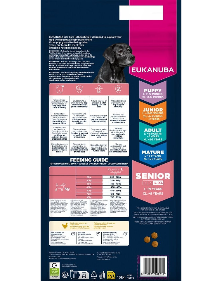 Ältere Hunde großer und riesiger Rassen benötigen eine Ernährung, die ihre Gesundheit, Vitalität und Beweglichkeit jeden Tag unterstützt. EUKANUBA Life Care wurde von Experten mit diesen Bedürfnissen im Hinterkopf entwickelt. Die reichhaltige Formel mit frischem Huhn liefert hochwertiges Protein, das hilft, die Muskeln in gutem Zustand zu halten und die tägliche Aktivität zu unterstützen.