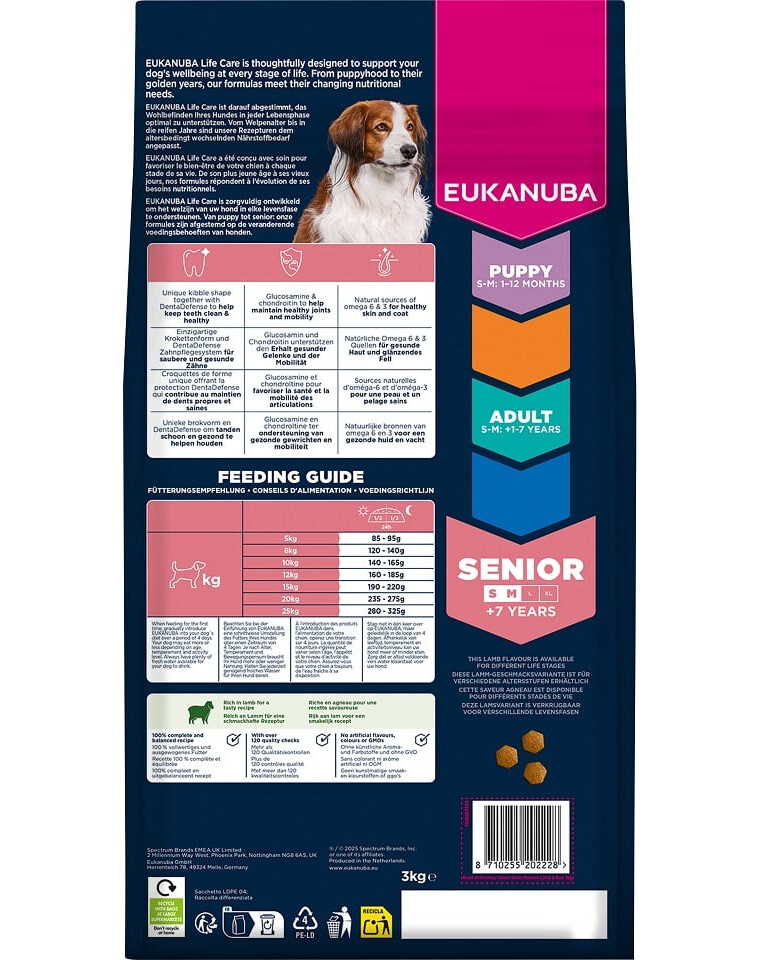 Trockenfutter EUKANUBA für ältere Hunde, reich an Lamm und Reis, ist 100% vollständig und ausgewogen und ideal für Hunde kleiner und mittlerer Rassen ab 7 Jahren.