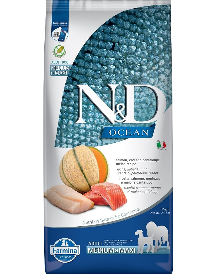 Das Futter enthält in seiner Zusammensetzung Lachs, Kabeljau, Kürbis und Cantaloupe-Melone. Die Hauptbestandteile des Futters sind Lachs und Kabeljau, die hervorragende Quellen für tierisches Eiweiß sind. Fisch ist eine Quelle von Fettsäuren, die entzündungshemmend wirken, die Haut stärken und das Fell mit Feuchtigkeit versorgen. Fischöl liefert eine starke Dosis an ungesättigten Omega-3-Fettsäuren mit entzündungshemmenden Eigenschaften. Die Heidelbeere zeichnet sich durch ihre hohe antioxidative Aktivität und ihren hohen Polyphenolgehalt aus, was die Ernährung von Hunden mit erhöhter körperlicher Aktivität perfekt ergänzt. Der hohe Anteil an Obst und Gemüse trägt zu einem hohen Gehalt an Vitaminen, Nährstoffen und Ballaststoffen bei, was die richtigen Voraussetzungen für die Entwicklung und Erhaltung der Kondition Ihres Hundes schafft. Die Rezeptur und der Energiewert des Futters sind für Hunde mittlerer und großer Rassen geeignet.