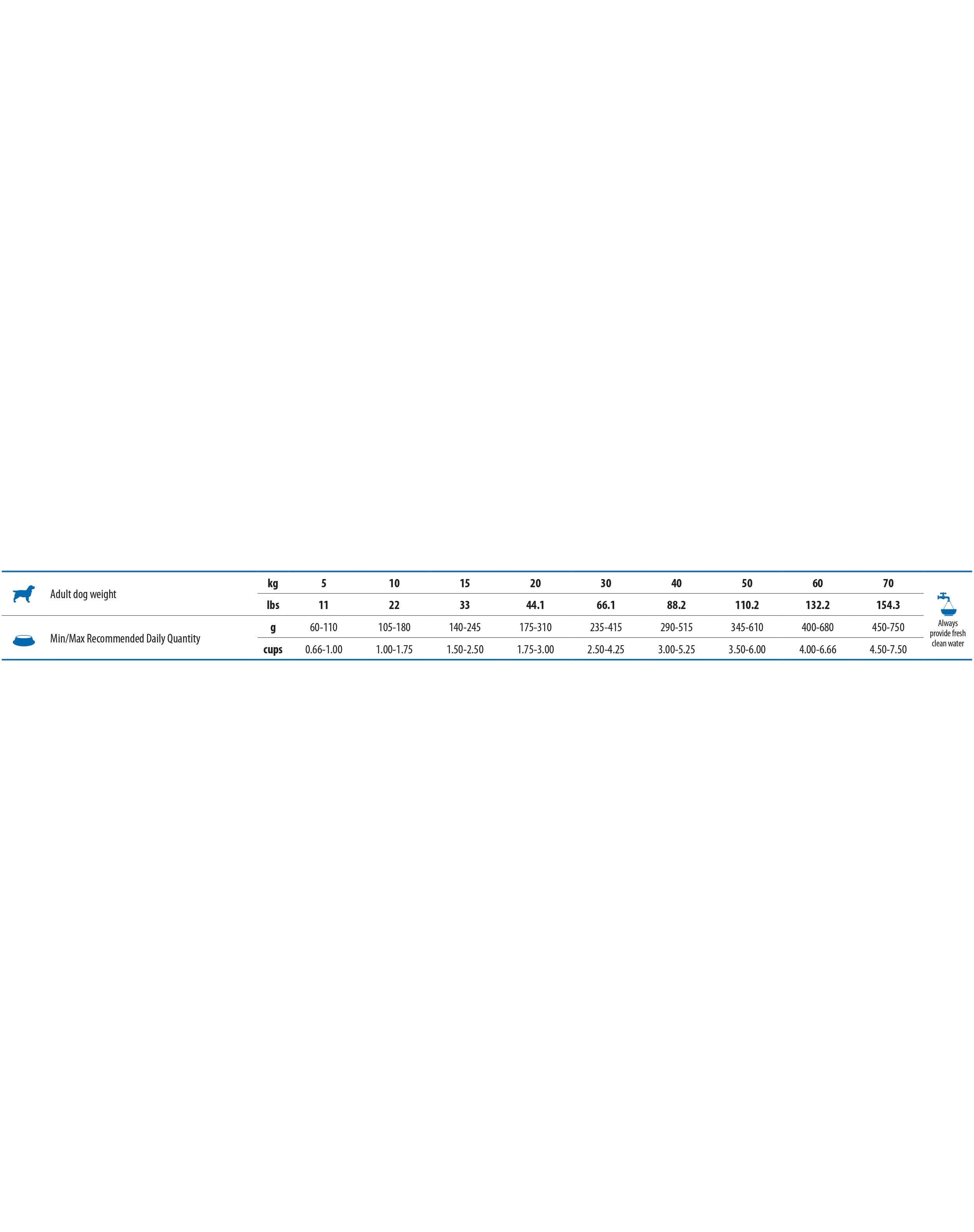 Rohprotein 35,00 %; Rohfett 10,00 %; Rohfaser 6,50 %; Luftfeuchtigkeit 8,00 %; Rohasche 8,20 %; Kalzium 1,10 %; Phosphor 0,90 %; Kalium 0,60 %; Natrium 0,50 %; Magnesium 0,07 %; Omega-6-Fettsäuren 2,00 %; Omega-3-Fettsäuren 0,40 %; DHA 0,15 %; EPA 0,10 %; Glucosamin 1200 mg/kg; Chondroitinsulfat 900 mg/kg.