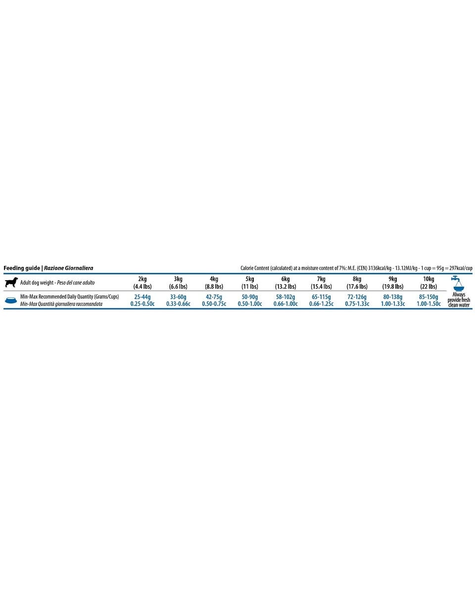Rohprotein 28,00 %; Rohfett 8,00 %; Rohfaser 8,20 %; Luftfeuchtigkeit 9,00 %; Rohasche 7,90 %; Kalzium 0,90 %; Phosphor 0,80 %; Natrium 0,30 %; Kalium 0,65 %; Magnesium 0,12 %; Omega-6-Fettsäuren 1,20 %; Omega-3-Fettsäuren 0,25 %; DHA 0,12 %; EPA 0,10 %; Glucosamin 1200 mg/kg; Chondroitinsulfat 900 mg/kg.