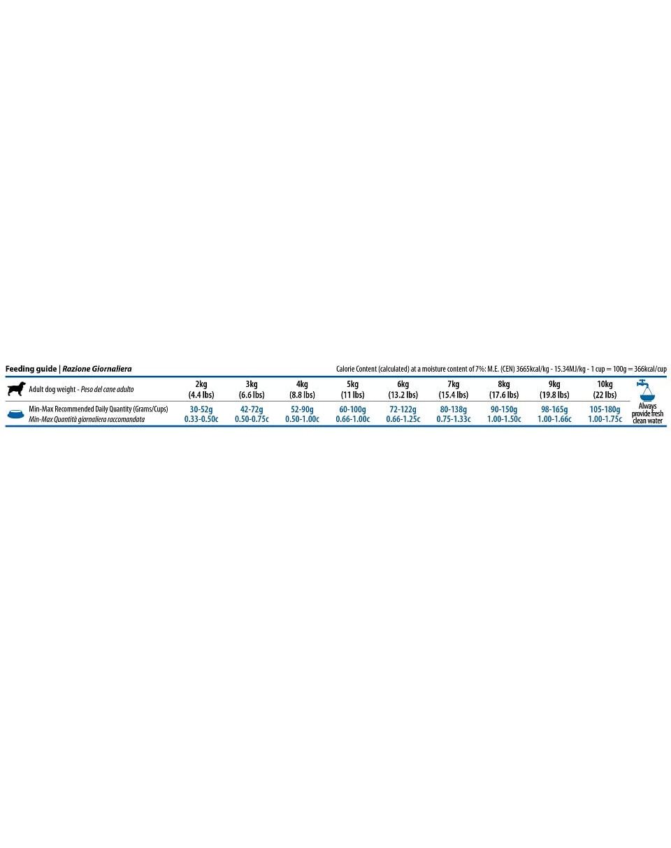 Rohprotein 23,00 %; Rohfett 12,00 %; Rohfaser 2,80 %; Luftfeuchtigkeit 9,00 %; Rohasche 7,90 %; Kalzium 1,10 %; Phosphor 0,90 %; Omega-3-Fettsäuren 0,40 %; Omega-6-Fettsäuren 2,20 %; DHA 0,20 %; EPA 0,10 %; Glucosamin 1200 mg/kg; Chondroitinsulfat 900 mg/kg.