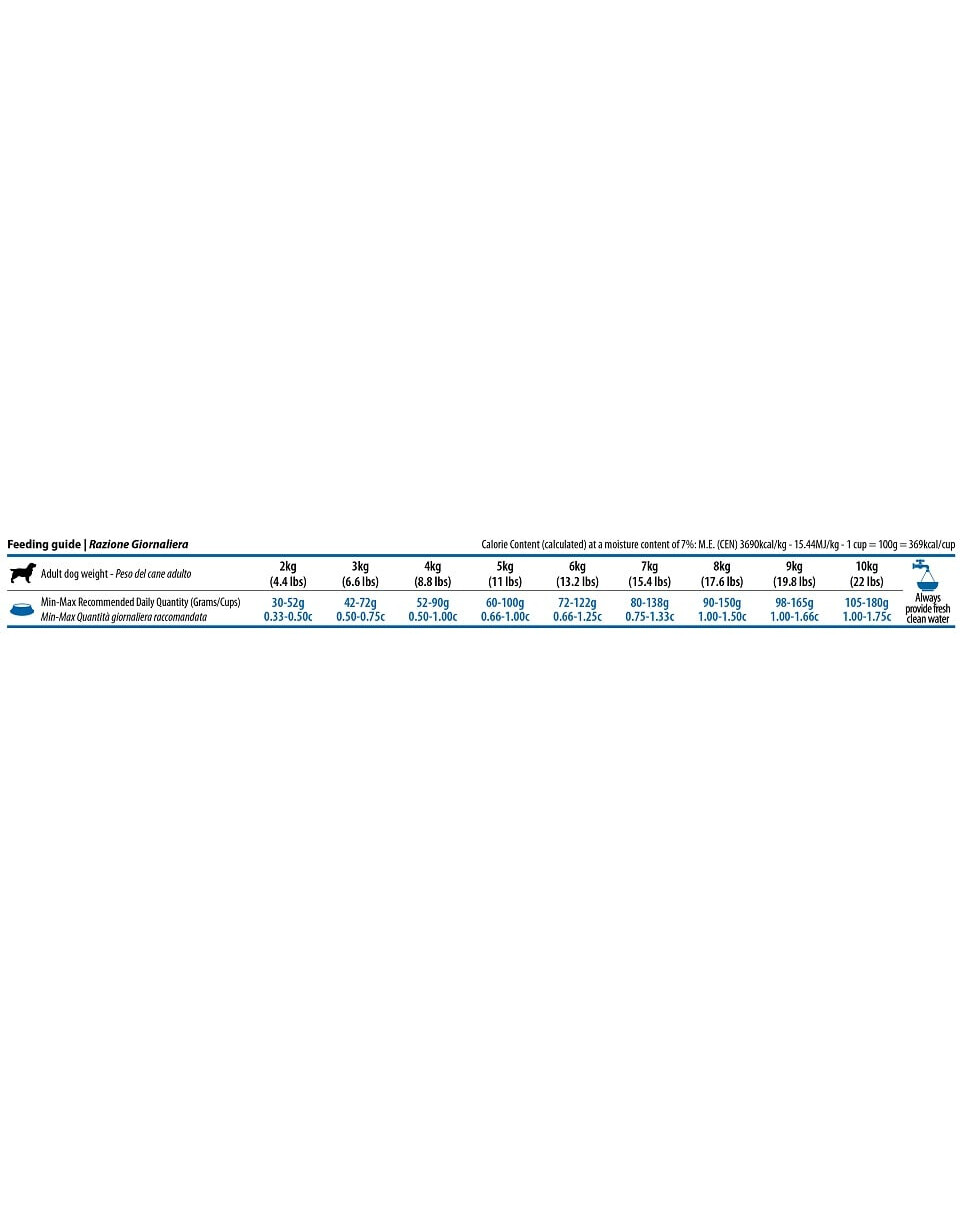 Rohprotein 23,00 %; Rohfett 12,00 %; Rohfaser 2,80 %; Luftfeuchtigkeit 9,00 %; Rohasche 7,20 %; Kalzium 1,00 %; Phosphor 0,80 %; Omega-6-Fettsäuren 2,20 %; Omega-3-Fettsäuren 0,40 %; DHA 0,12 %; EPA 0,10 %; Glucosamin 1200 mg/kg; Chondroitinsulfat 900 mg/kg.