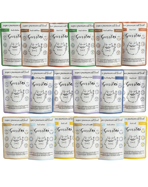 Vollwertiges komplettes und hervorragend bilanziertes Super Premium Katzenfutter. Wird zu 100 % aus Frischfleisch höchster Qualität unter Einhaltung der höchsten Standards für Nahrungsmittel für Menschen hergestellt. Gusto ist die Quintessenz einer guten und gesunden Ernährung. Enthält sehr viel Fleisch ideal den spezifischen Nahrungsbedürfnissen von Katzen entsprechend. Es ist ein Einzelprotein-Futter, also ganzheitlich, leicht verdaulich und sehr gut assimilierbar, auch für Katzen mit einem empfindlichen Magen-Darm-Trakt empfohlen. Angewendet auch bei Eliminierungsdiäten bei Nahrungsmittelallergien. Ein ausgezeichnet ausgeglichenes Verhältnis von Kalzium /Phosphor minimiert das Risiko von Harnapparat- Nierenerkrankungen. Zusätzlich enthält das Futter Gussto viele erforderliche Vitaminen und Mineralstoffe, ist reich an Taurin und Biotin, und sein Bestandteil ist das wohltuende Distelöl – Reich an ungesättigten Fettsäuren, welches entzündungshemmende Wirkung aufweist, die Verdauung und Regenerationsfunktionen der Leber regelt, wie auch das Abwehrsystem stärkt.