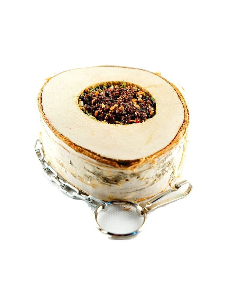Birkenschaukel für Nagetiere mit Futter im Inneren.