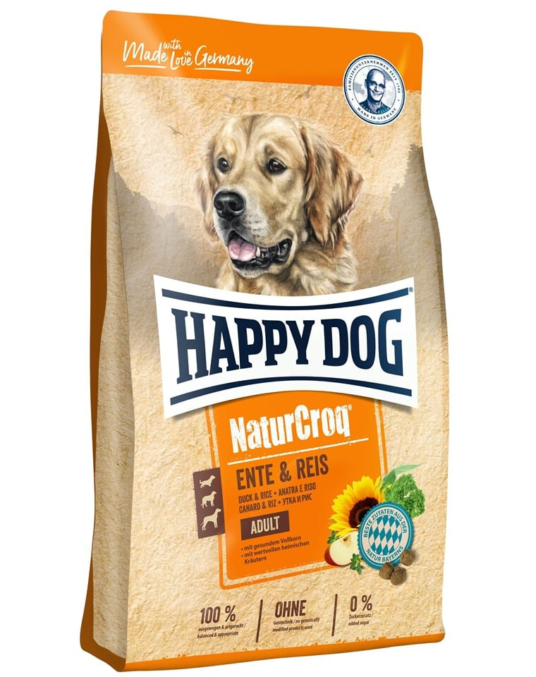 Happy Dog NaturCroq Ente & Reis ist ein vollwertiges Futter, das aus hochwertigen Zutaten aus der bayerischen Landwirtschaft hergestellt wird. Knusprige Kroketten enthalten schmackhafte Ente als Quelle für hochwertiges tierisches Protein sowie leicht verdaulichen Reis, der gut von Hunden vertragen wird.