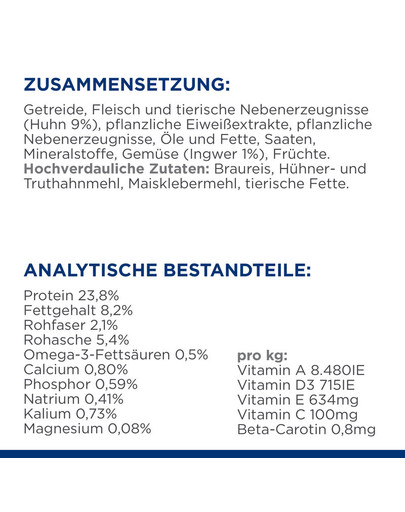 : Getreide, Fleisch und tierische Erzeugnisse (Huhn 9%), pflanzliche Eiweißextrakte, Erzeugnisse pflanzlichen Ursprungs, Öle und Fette, Saaten, Mineralstoffe, Gemüse (Ingwer 1%), Obst. Leicht verdauliche Zutaten: Reisstroh, Hühner- und Putenmehl, Maisklebermehl, tierisches Fett.