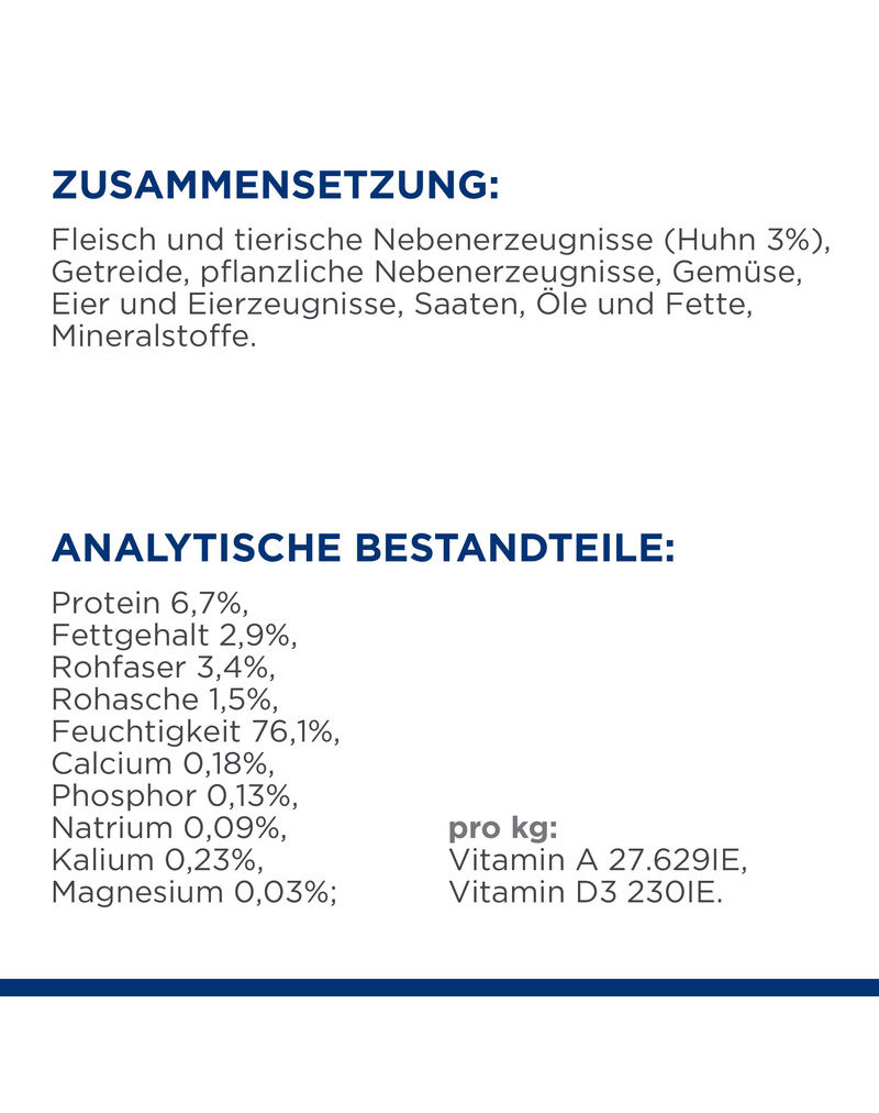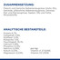 Analyse: Eiweiß 7,2%, Fett 3,4%, Kohlenhydrate (ENA) 9,5%, Ballaststoffe (roh) 4,0%, Gesamtballaststoffe 5,90%, Kalzium 0,20%, Phosphor 0,15%, Natrium 0,10%, Kalium 0,21%, Magnesium 0,02%, Omega-3-Fettsäuren 0,23%, Omega-6-Fettsäuren 0,67%.