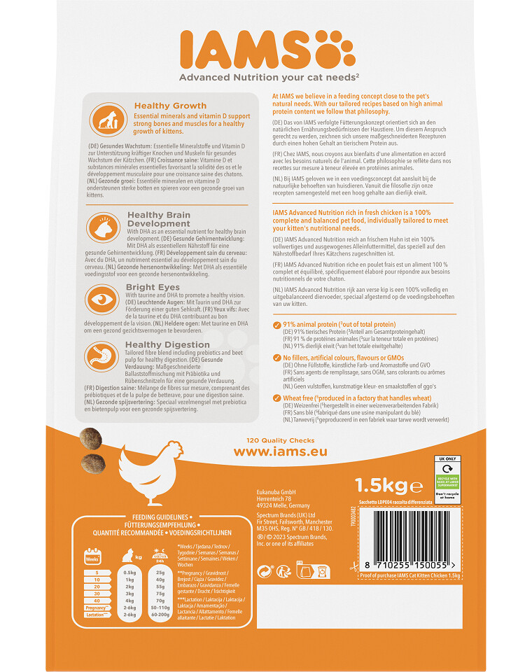 IAMS for Vitality Kitten Food ist ein 100% komplettes und ausgewogenes Spezialfutter, das köstlich schmeckt und die Entwicklung Ihrer Katze anregt.