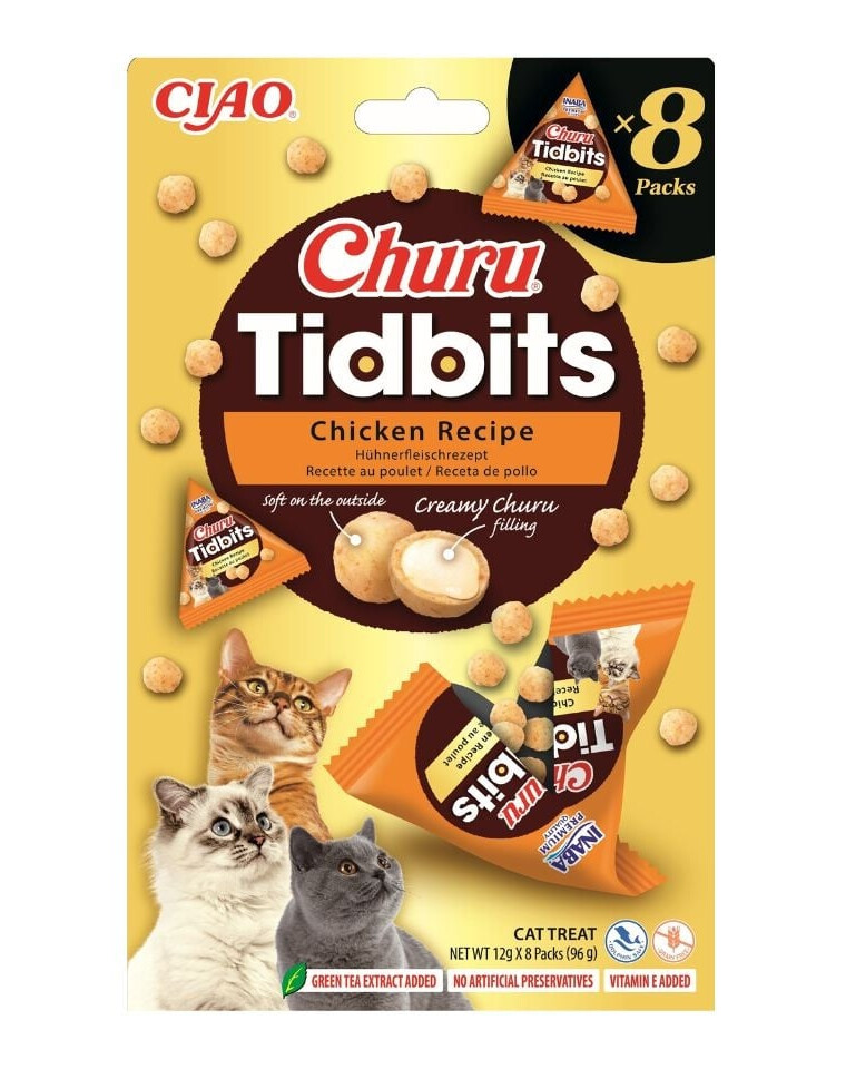 INABA Churu Tidbits sind einzigartige, weiche Snacks, die eine zarte Hülle mit einer cremigen Churu-Füllung verbinden. Die Hühner-Version ist eine Empfehlung für Katzen, die klassische, fleischige Geschmäcker und ausgeprägte Aromatik lieben.