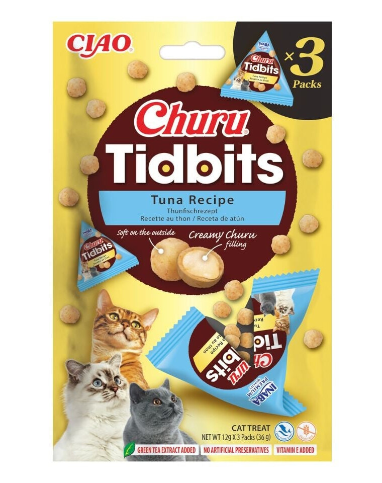 INABA Cat Churu Tidbits sind einzigartige, weiche Leckerlis, gefüllt mit köstlicher, cremiger Churu-Füllung. Durch die Kombination von zwei Texturen – zartem Überzug und samtigem Inneren – sind sie ein von Katzen geliebter Snack, ideal für den täglichen Gebrauch.