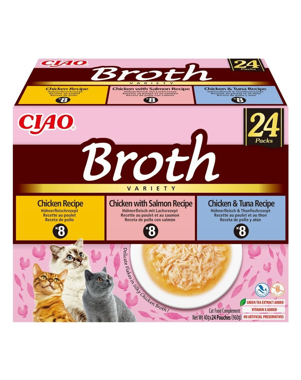 INABA Ciao Broth Variety ist ein einzigartiges, leichtes und aromatisches Ergänzungsfutter für Katzen, das auf zarten Fleischstücken in klarem, natürlichem Brühe basiert. Die Variante „Variety“ enthält verschiedene Geschmäcker – Huhn, Thunfisch und Lachs – und befriedigt selbst die wählerischsten Katzenpaletten.