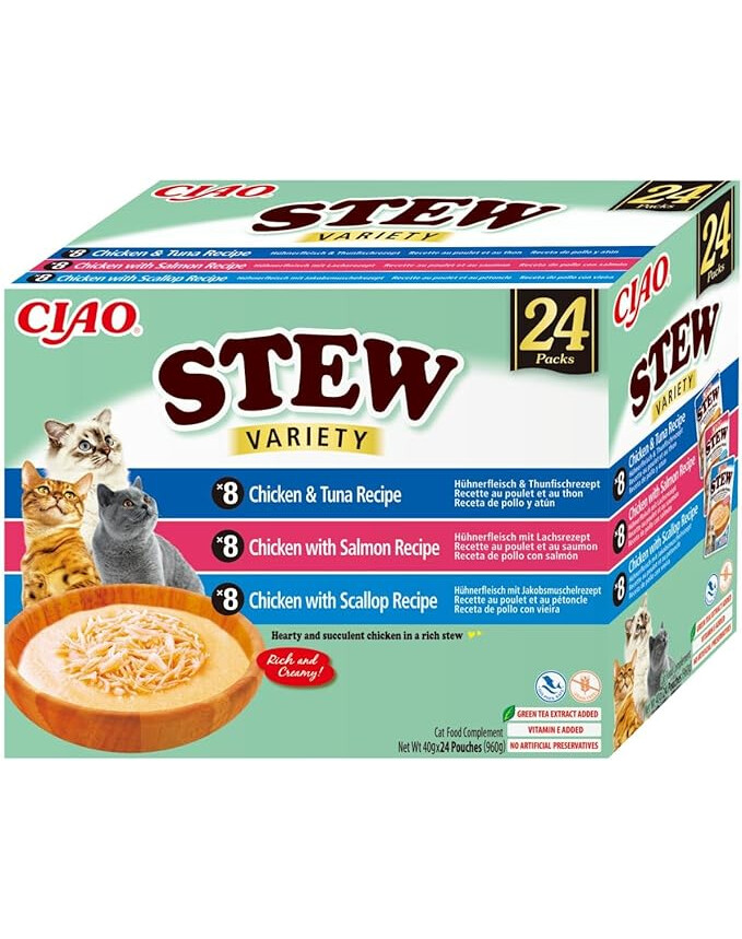 INABA Ciao Stew Creamy Variety ist ein Premium Ergänzungsfutter für Katzen, das zartes Fleisch mit einer besonders cremigen, aromatischen Basis kombiniert. In der größeren Verpackung 24×40 g findest du verschiedene Geschmäcker – Huhn, Fisch und Jakobsmuscheln – alle in einer samtigen, cremigen Sauce.