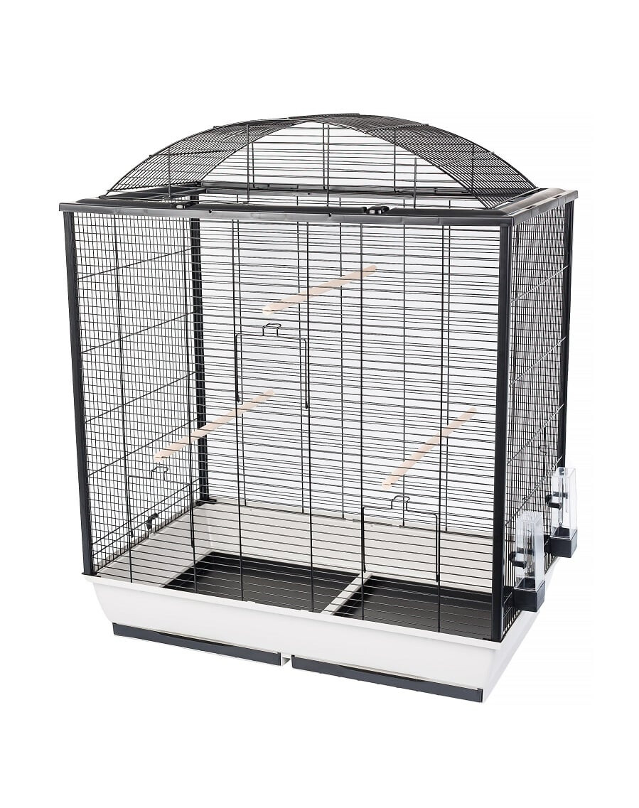 Der Käfig ist mit 2 großen Futterstellen und 3 Sitzstangen ausgestattet, die den Vögeln die Möglichkeit geben, sich auszuruhen oder zu spielen, und die auch als Platz zum Anbringen von Vogelspielzeug oder Zubehör verwendet werden können. Die Platzierung der Futterstellen wurde so angepasst, dass die Vögel optimal fliegen und von Platz zu Platz hüpfen können.
