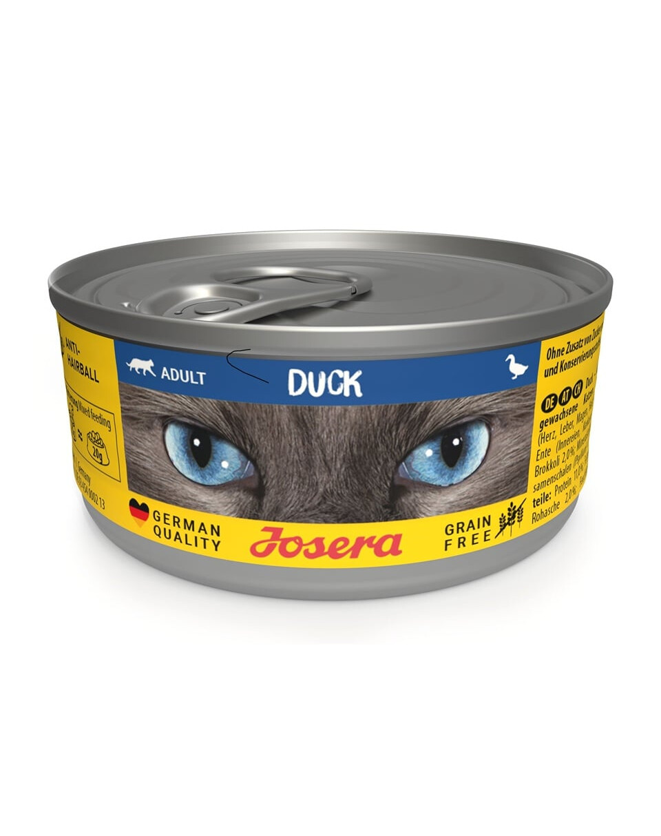 Wenn Ihr Haustier die Mahlzeit mit Genuss frisst, ist auch sein Halter zufrieden. Das ist ein weiterer Grund, um für eine schmackhafte Abwechslung in der Ernährung zu sorgen – zum Beispiel mit unserem neuen Nassfutter Josera Duck aus der Dose! Der Geschmack von Ente wird selbst wählerische Katzen zum Fressen animieren. Das Nassfutter Duck in der Dose liefert Katzen eine größere Menge Flüssigkeit, was für Katzen, die ungern Wasser trinken, von Vorteil ist.